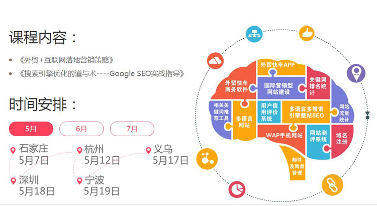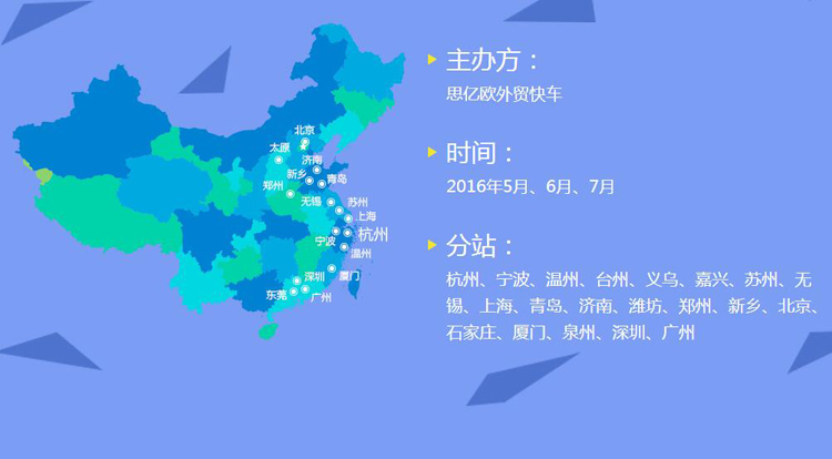 思亿欧外贸快车将组建外贸网络营销理论和实践的专家讲师团队,于2016年5月至7月,在全国近20个重点城市密集巡回开展外贸快车SEO 营销大讲堂,诚邀外贸快车用户及潜在用户参加。